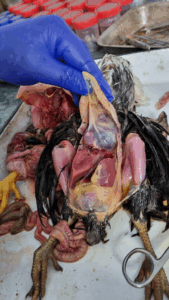 – Intestine, trachea, proventriculus, brain for isolation and identification – Pieces of all internal organs for histopathological examination |