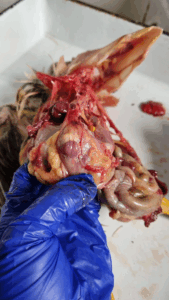 - A cut is made through the corner of the beak with the blunt point of scissors inside cut down through the neck, pharynx, oesophagus and crops exposing the mucosa.