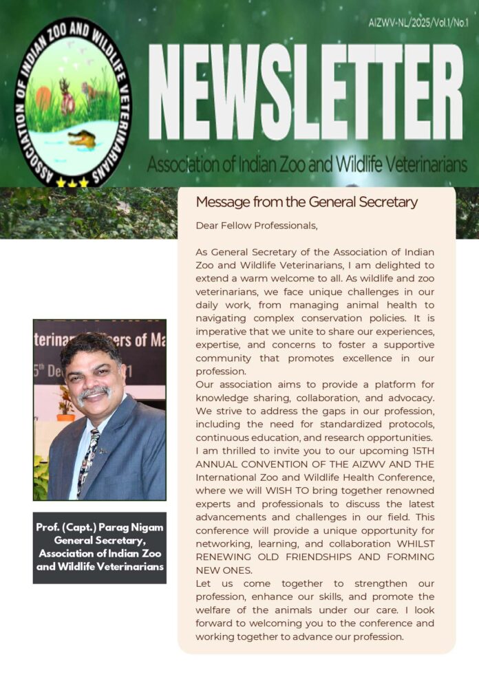 The AIZWV Newsletter plays a crucial role in strengthening wildlife veterinary science and conservation efforts in India. The visionary leadership of Prof. (Capt.) Dr. Parag Nigam has been instrumental in making this newsletter a valuable tool for education, collaboration, and policy advocacy. Through his dedication and expertise, Dr. Nigam has significantly contributed to advancing the role of veterinarians in wildlife conservation.