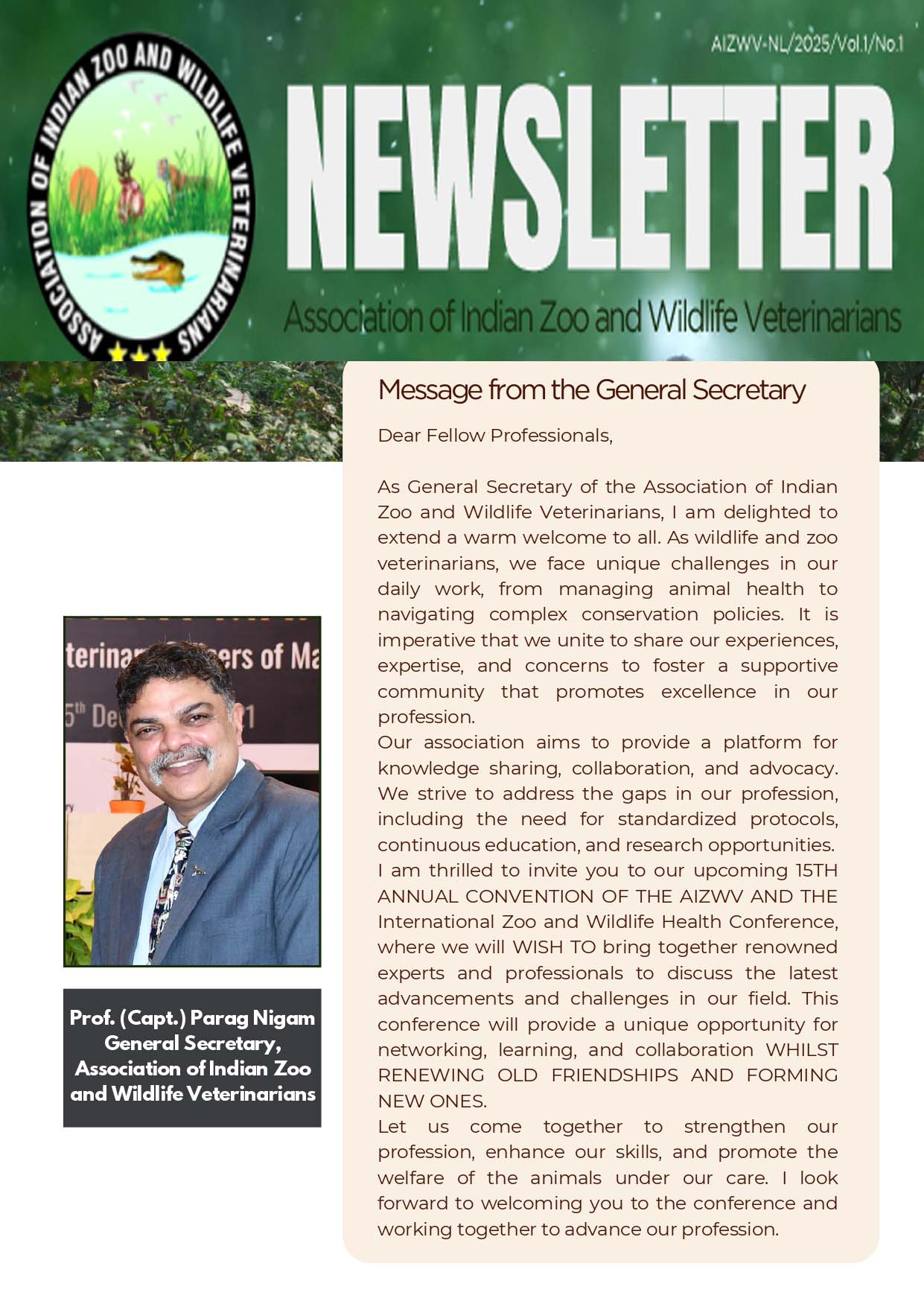 Prof. (Capt.) Dr. Parag Nigam, the General Secretary of AIZWV, has played a pivotal role in shaping and ensuring the success of this newsletter. His leadership and vision have helped make this publication a valuable resource for wildlife veterinarians and conservationists across India.