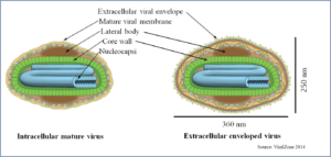 Including LSDV Capripoxviruses in the Poxviridae family are large brick shaped, enveloped with complex symmetry 300 x 270 x 200 nm in size. The surface membrane displays surface tubules or surface filaments. The virus has two distinct infectious virus particles i.e. the intracellular mature virus and the extracellular enveloped virus (ViralZone 2014, Schoch et al. 2020). The large, double-stranded DNA (dsDNA) virus is very stable, and very little genetic variability occurs. Therefore, for LSDV, farm-to-farm spread cannot be followed by sequencing the virus isolates, as is done with other transboundary diseases, e.g. foot-and-Mouth disease (Tuppurainen et al. 2017).