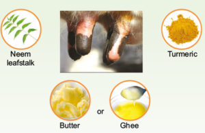 - In mild teat infection, freshly plucked & clean leaf stalk of neem leaves and making the paste of turmeric powder with butter or ghee and coat this paste over affected teat.