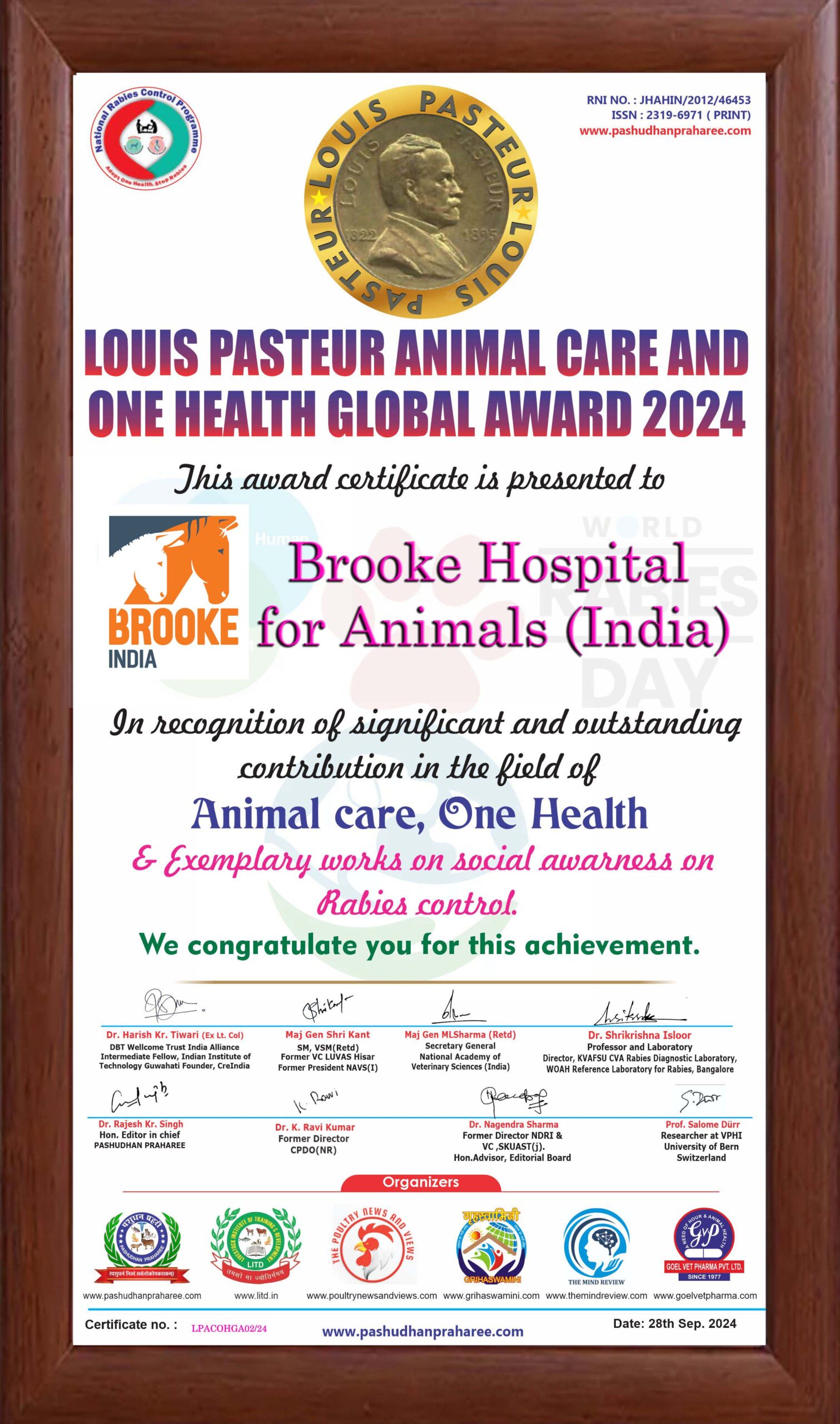 Pashudhan Praharee and it’s sister concerns feels proud to felicitate Brooke India with the most prestigious LOUIS PASTEUR ANIMAL CARE AND ONE HEALTH GLOBAL AWARD 2024 for their recognition of significant and outstanding contributions in the field of “Animal care and One Health approach ” on the occasion of World Rabies Day, 28th September 2024.