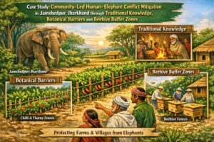 The case study highlights how botanical barriers (lemon, karonda, agave, neem, tulsi, vetiver) combined with beehive fences not only help deflect elephant movement away from standing crops, but also generate side benefits such as honey income, pollination services, soil conservation and stronger community ownership of conservation. Supported by corridor mapping, early-warning networks and selective use of solar lighting and other tools, the Dalma experience demonstrates that layered, community-centered strategies can significantly soften human–elephant conflict, and offers a replicable model for other conflict hotspots in Jharkhand and eastern India.