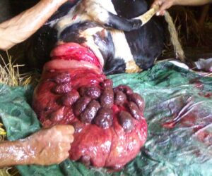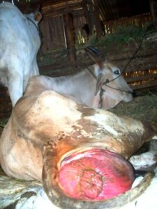 योनि का उभार और आगे को बढ़ाव के साथ या उसके बिना गर्भाशय ग्रीवा का आगे बढ़ना आमतौर पर गोमांस गायों में होता है। योनि और गर्भाशय ग्रीवा के आगे को बढ़ाव अधिक बार देखा जाता है जो गर्भावस्था के अंतिम दो से तीन महीनों के दौरान देखने को मिलता है ।