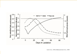 During early postpartum, high-producing dairy cows undergo a period of extensive tissue catabolism because of negative nutrient balance. Homeorhetic controls assure that nutrients are partitioned to favour lactation at the same time that homeostasis secures survival. Increased nutrient needs associated with suppression in appetite leads to negative energy balance. Commonly observed in last week of gestation and in first two months postpartum. High producing dairy cows’ experiences NEB during the first 4 to 6 weeks postpartum, which often averages -5 Mcal NEL/day, the equivalent of approximately 1 kg of body weight loss/day, mostly from adipose tissue. Reduced circulating concentrations of glucose and insulin upregulate the lipolytic signals that result in hydrolysis of stored triglycerides from the adipose tissue and increase the availability of NEFA to be used as an energy source. severe negative energy balance (NEB) based on excessive plasma non-esterified fatty acids (NEFA)), or both, affected cows had increased anovulation, reduced pregnancy per AI, and increased pregnancy loss. Maintaining metabolic health to minimize the risk of clinical and subclinical health problems are expected to benefit fertility of dairy cows.