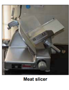 १. स्लाइसर: मांस और मांस उत्पादों को विभिन्न आवश्यकताओं के लिए पतली स्लाइस के रूप में काटा जाता है। यह एक घूमने वाले ब्लेड द्वारा किया जाता है जिसे विभिन्न मोटाई के स्लाइस प्राप्त करने के लिए समायोजित किया जा सकता है। मांस के टुकड़े करने के लिए पहले से ही फिट किये गए निर्मित ब्लेड शार्पनर भी उपलब्ध हैं। विभिन्न उत्पादों के लिए विभिन्न क्षमताओं और प्रकारों के स्लाइसर उपलब्ध हैं।