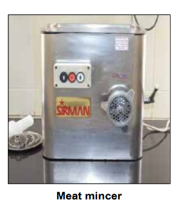 २. मिन्सर: इसका उपयोग मांस के आकार को विभिन्न कणों के आकार में कम करने के लिए किया जाता है। विभिन्न छेद आकार (3, 5, 8 और 13 मिमी) की ग्राइंडर प्लेटों की मदद से मांस को उत्पाद की आवश्यकता के अनुसार आवश्यक कण आकार में छोटा किया जा सकता है। कीमा बनाया हुआ मांस का उपयोग विभिन्न मूल्य संवर्धित मांस उत्पादों विशेष रूप से इमल्शन / पुनर्गठित प्रकार के उत्पादों को तैयार करने के लिए किया जाता है। बेहतर मिनसिंग और संपूर्ण उत्पादन प्राप्त करने के लिए ब्लेड और चाकू की उचित फिक्सिंग और मिन्सिंग के समय मांस का कम तापमान बनाए रखना महत्वपूर्ण है।