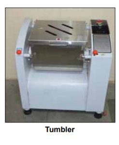 ४. टम्बलर: यह मांस के टुकड़ों को बार बार गिराने के कारण होने वाले दबाव प्रभाव के कारण मांस के तंतुओं के विखंडन और इसके माध्यम से मांस के टुकड़ों से प्रोटीन निकल कर सतह पर निकालने में मदद करता है। इसमें एक ड्रम होता है जिसके अंदर पैडल होते हैं। जब सिलेंडर मांस के साथ घूमता है, तो गिरने से होने वाले प्रभाव से क्योरिंग सामग्री के मिश्रण की मांस में प्रवेश में मदद मिलेगी। वैक्यूम टंबलर का उपयोग लिपिड ऑक्सीकरण को कम करेगा। पुनर्गठित मांस उत्पादों को तैयार करने के लिए टम्बलर एक महत्वपूर्ण आवश्यकता है।