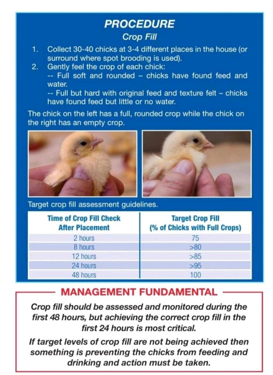 • A high crop fill percentage (above 90% within 12 hours of placement) reflects good brooding conditions, feed availability, and water access.