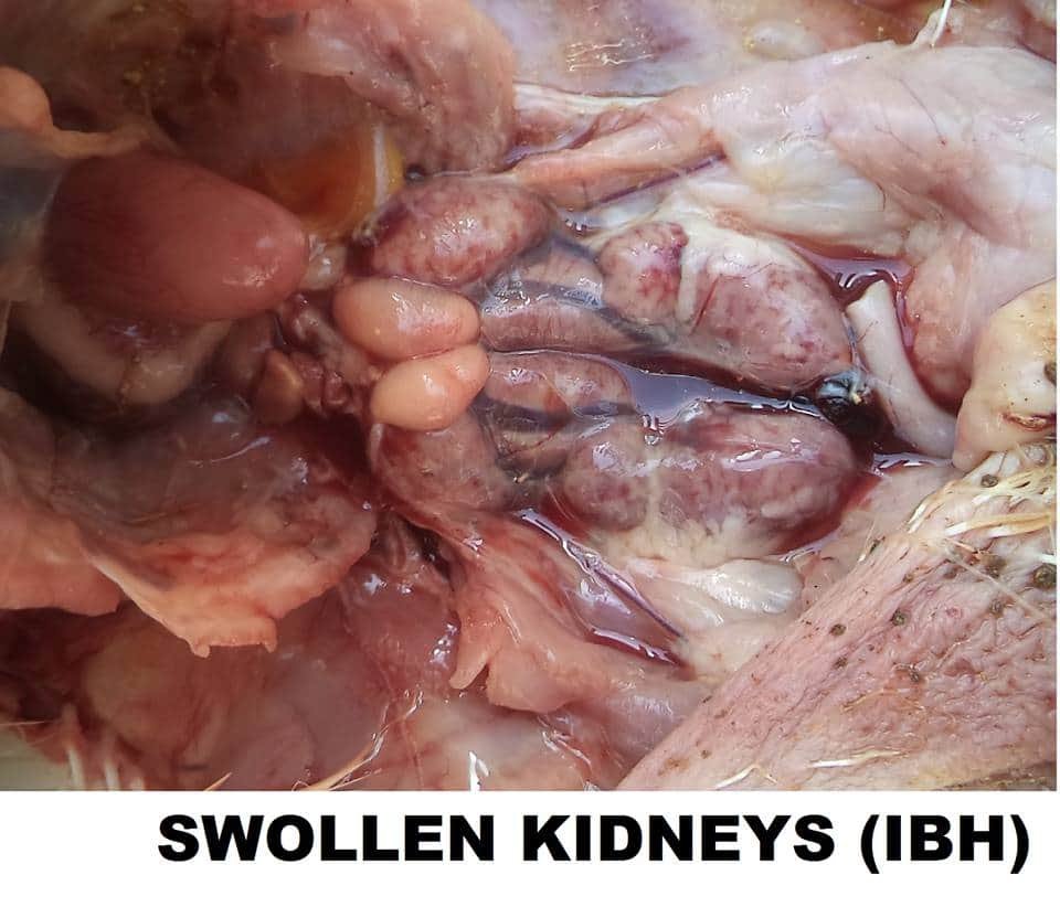 Affected chickens have mottled livers, many with pinpoint necrotic and haemorrhagic spots. Pale bone marrow and, in some cases in presence of infectious anemia, gangrenous dermatitis can be seen. Kidneys are pale and swollen. The spleen is usually quite small (atrophy). If Gumboro disease (infectious bursal disease) has been present in the birds, even if subclinical, the bursa of Fabricius will be very small (atrophic). Such chickens are immunesuppressed and usually have more severe cases of inclusion body hepatitis and/or infectious anaemia. Mature birds do not have clinical signs of adenovirus infection, they only start showing antibodies in their blood.
