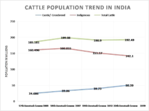 As per the livestock census 2019, India has 14.21 crore indigenous cattle and 5.13 crore exotic/ cross bred population in India. The majority indigenous cattle (73.39%) have however, declined by 6.0% from that of previous census of 2012. There had been radical changes within cattle population over the last couple of years indicating a shift in the priority of the farmers from bullock production to milk production. In spite of all unfavourable circumstances indigenous cattle contributing immensely in the economy of the country through milk, draught, urine, dung, bones, hides, horns, etc.