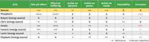 - Reduced pH, buffering capacity as well as antibacterial and antifungal effects in feed