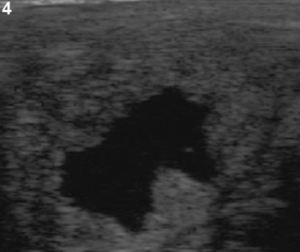 The exploration of the uterus in the non-pregnant female aims to either determine the stage of the oestrous the uterus (Beal et al., 1992). The histology of the uterus determines its echogenicity as the submucosa can be visualized as an anechoic layer beneath the endometrium. During the follicular phase, under the influence of oestrogens, the blood vessels in the submucosa become hyperaemic, the endometrium becomes oedematous, increasing its thickness, and the anechoic vascular zone is more easily visualized. The content of the uterine lumen may also vary during the oestrous cycle, being typically absent during the luteal phase, whereas a small amount of fluid may be present during the follicular phase (Barlund et al., 2008). Apart from the oestrus phase various pathologies and pregnancy status can also be visualised through ultrasonography (Fig: 5)