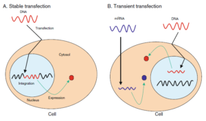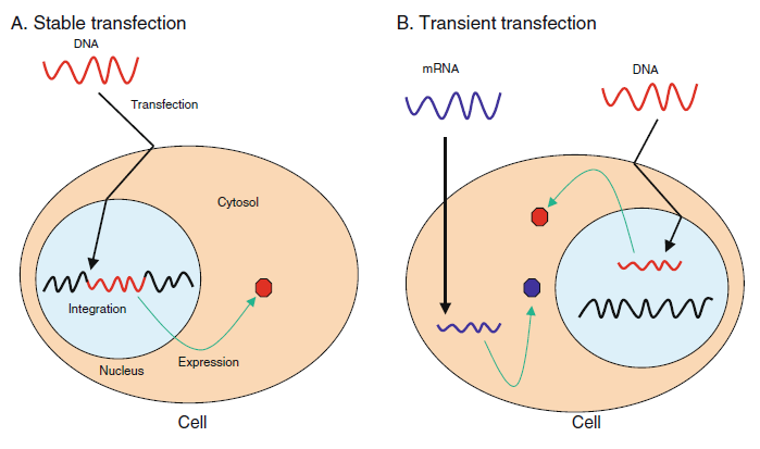 • Stable transfection: The introduced genetic material are integrated into the host genome resulting in a sustained transgene expression (Fig. 1a). This process is required when long-term expression of the sequence is desired.A selection marker is generally used to identify cells that have successfully integrated the sequence of interest.
